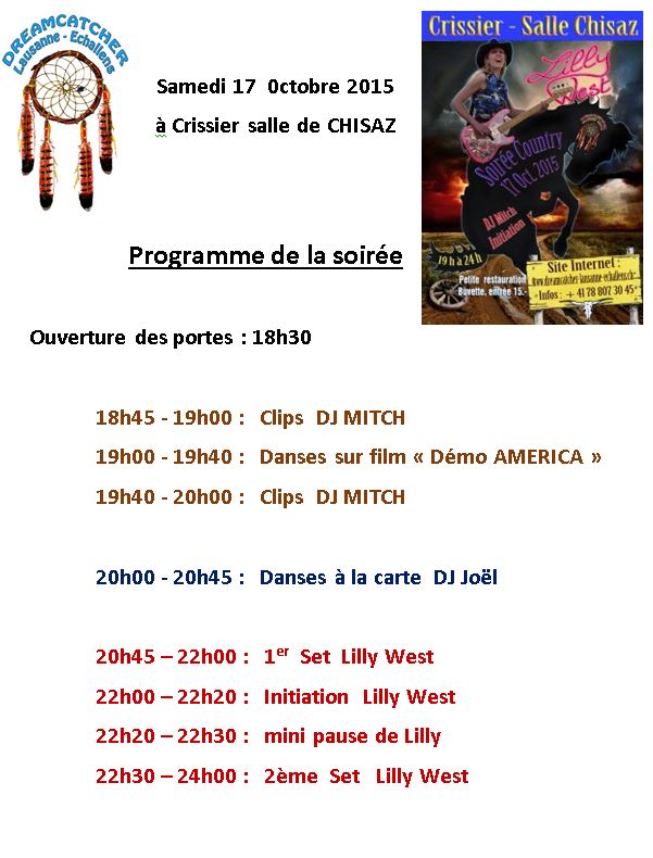 Le 17 octobre 2015 à Crissier : LILLY WEST (clic pour ouvrir) Surtout ne manquez pas cette soirée Sa Play liste est en ligne : Play List Lilly West La Play liste de DJ Mitch est en ligne : Play list DJ Mitch oct 2015 Lien sur liste de Lilly West : http://www.lillywest.fr/ <—- clic sur image pour […]